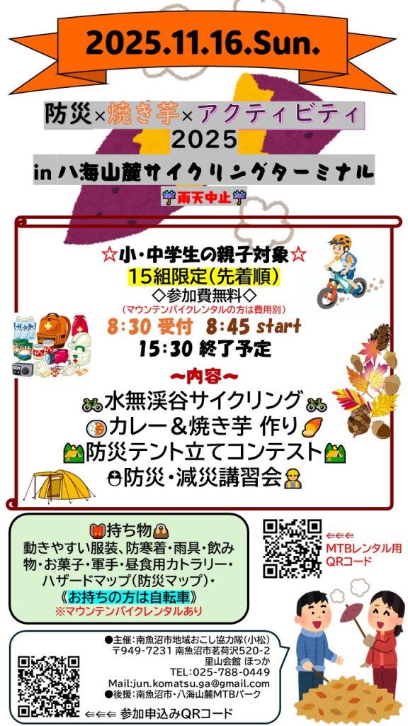 11/16(日) 防災×焼き芋×アクティビティ2025 in 八海山麓サイクリングターミナル開催のお知らせ